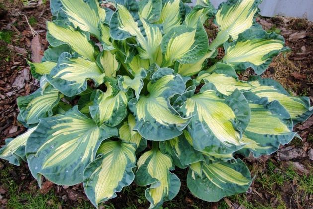 Листья, ярко-золотистые весной, переходят в оттенки шартрез осенью. Лист присобран, кайма широкая, зелено-голубая, с язычками к центру.
