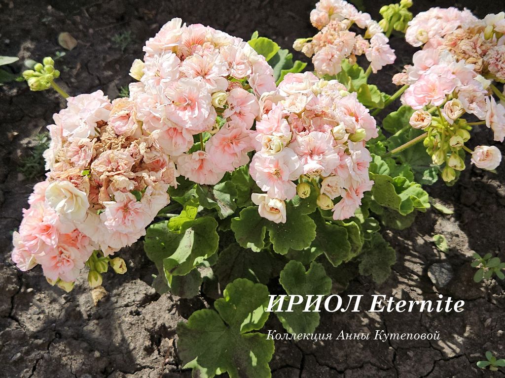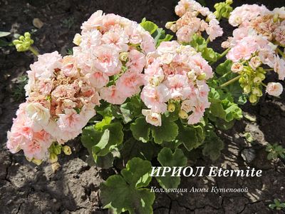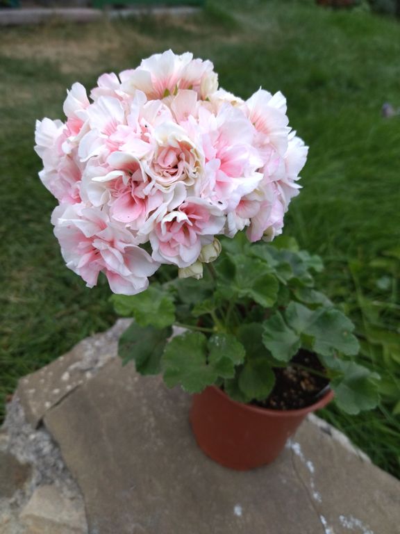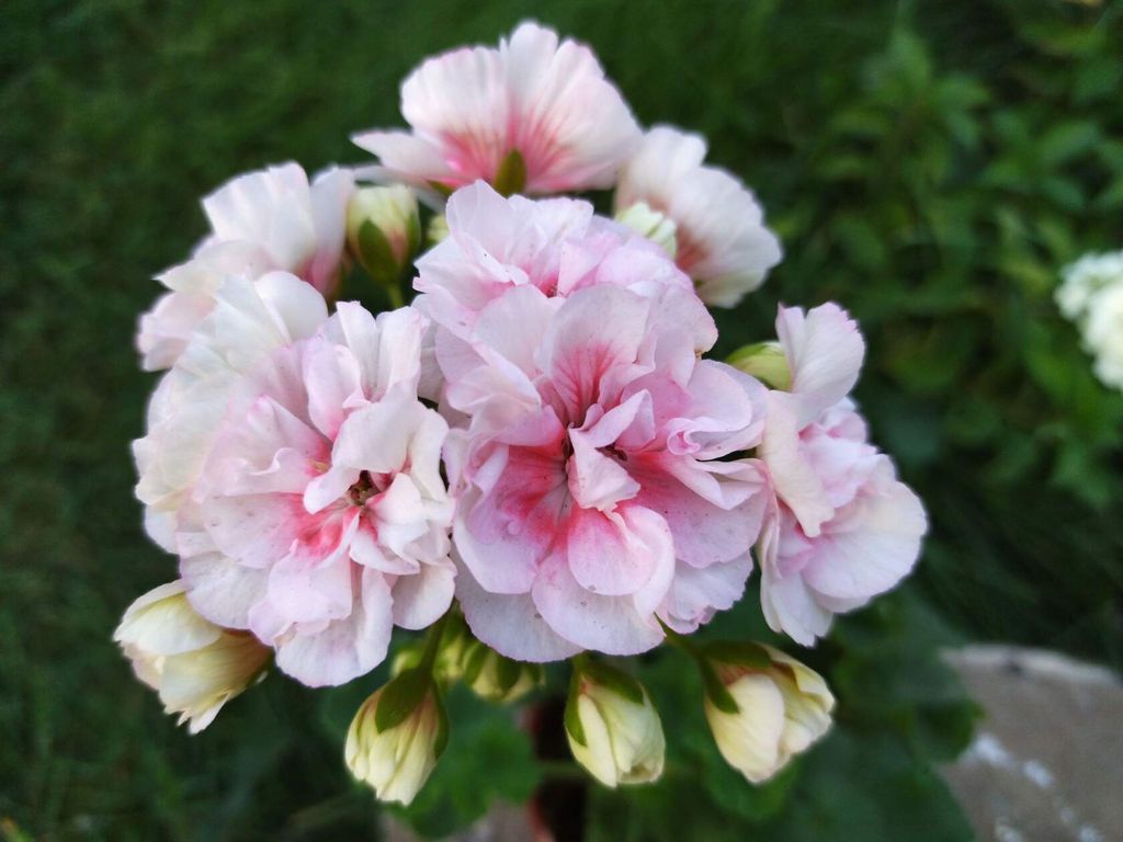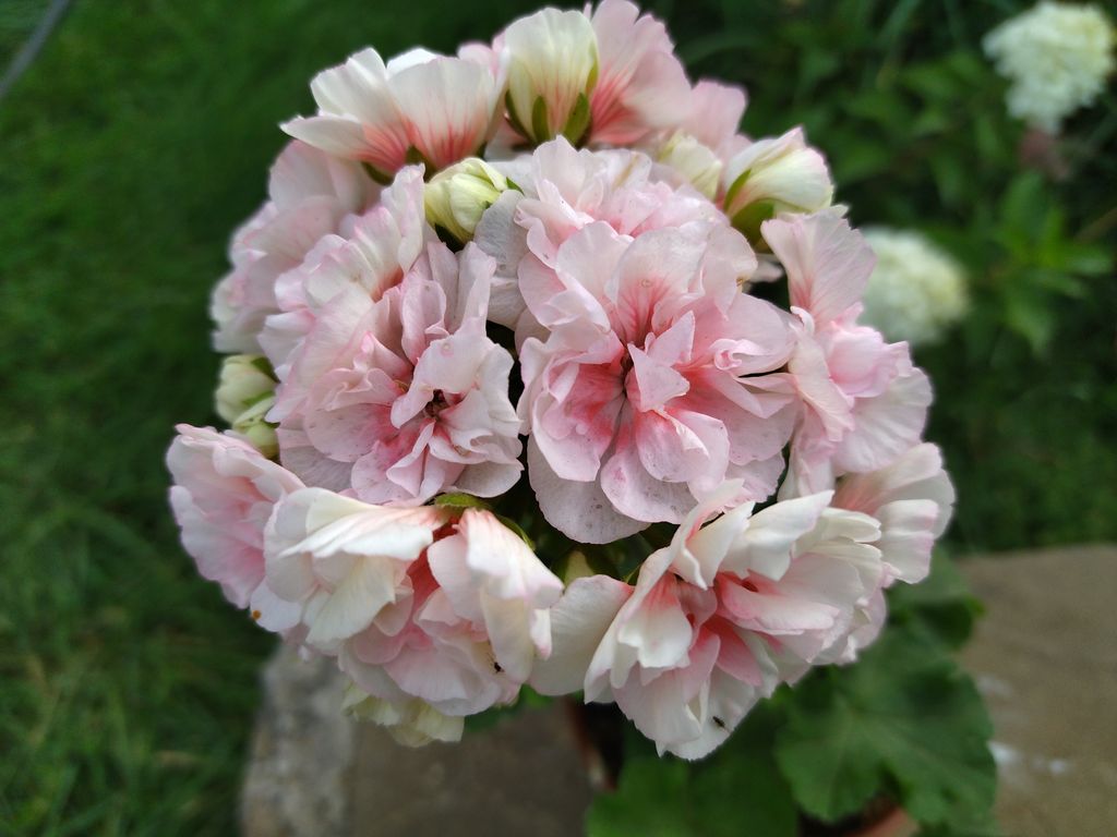 Крупные плотные шапки махровых лососево-бело-розовых цветов.