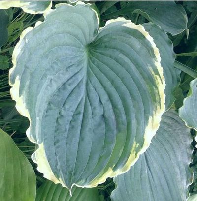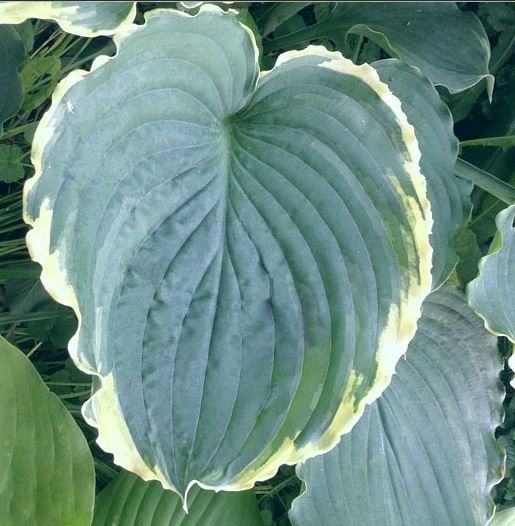 Листья плотные, синие, с тонкой волнистой кремово-белой каймой.