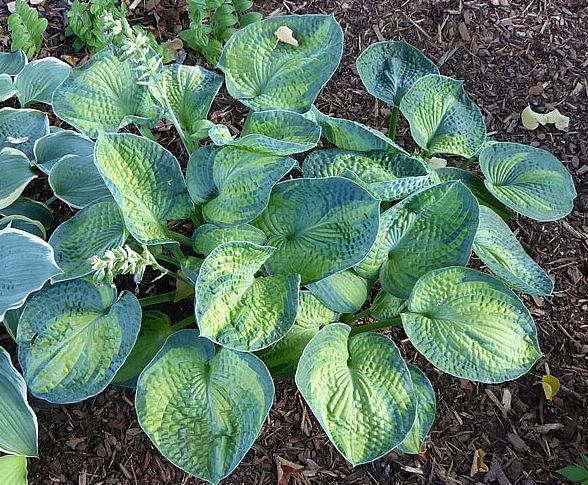 Листья очень плотные, морщинистые и жесткие, округлой чашевидной формы. Середика листа шартрезно-золотистая, край широкий, нерегулярный, сине-зеленый, покрытый восковым налётом.