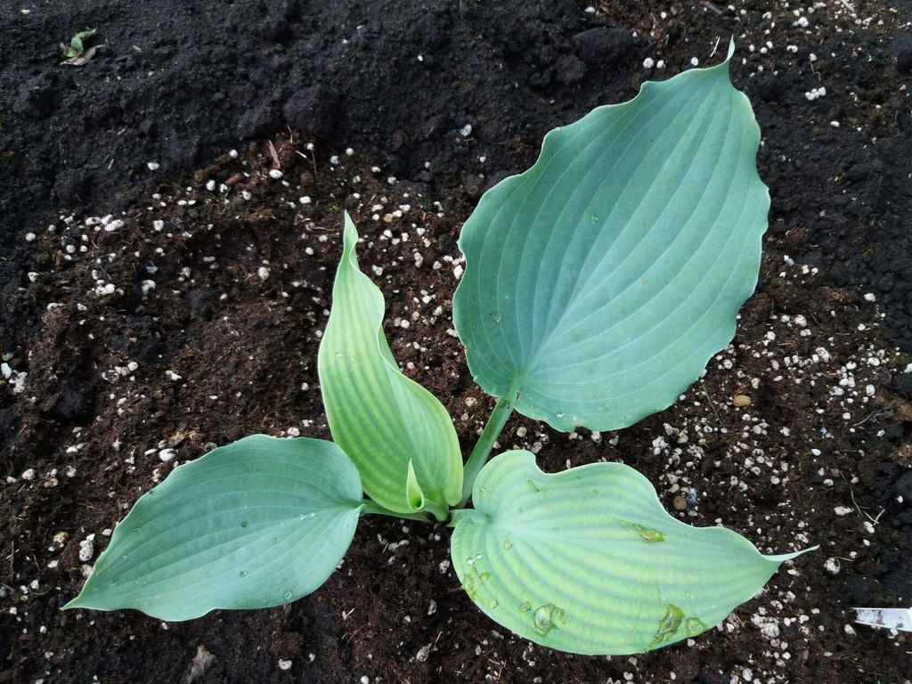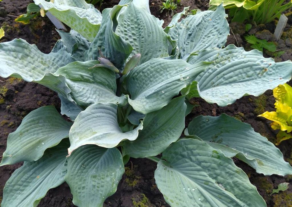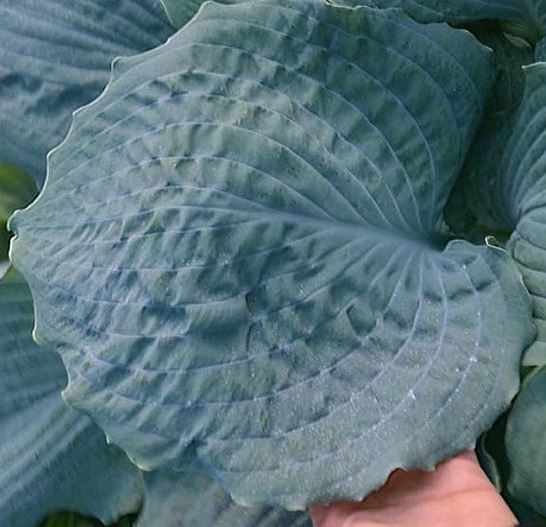 Листья с волнистым краем, голубые, жатые, бархатистой структуры. Бархатистость создаётся пруиновым налётом, у этой хосты его много-вид изумительный!
