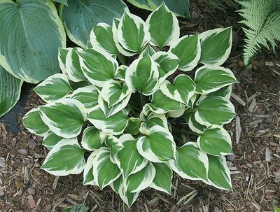 Округлые зеленые листья с широкой белой каймой.