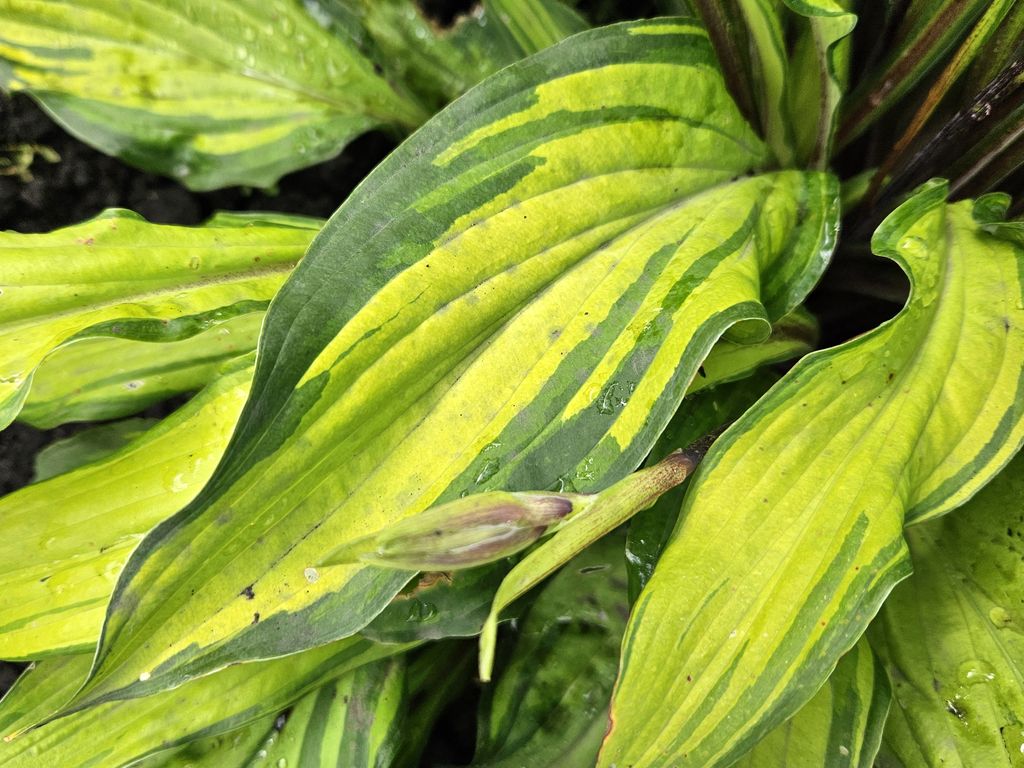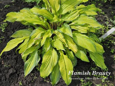 Листья длинные, жатые, золотисто-желтые, с зелёной перистой окантовкой и волнистым краем.