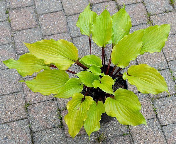 Листья желтые, блестящие, с волнистым краем, на гранатово-красных черешках.