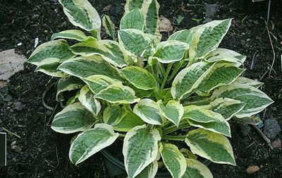 Листья интенсивно жатые, тёмно-зелёные со сливочно-белым краем.