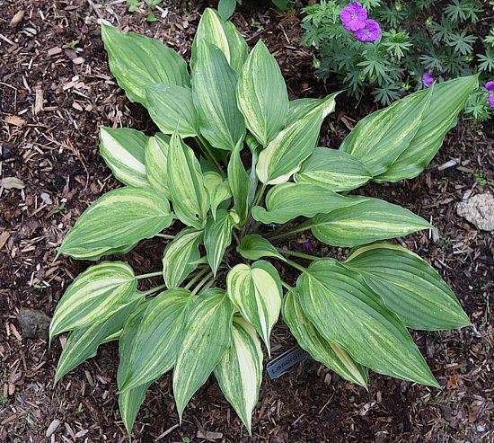 Листья серо-зеленые с желтыми и белыми полосками на красных черешках.