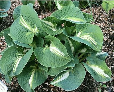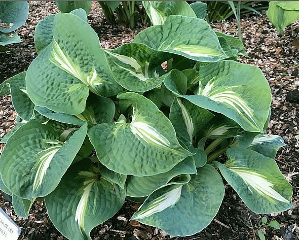 Листья плотные, круглые, белые с широкой сине-зеленой каймой.