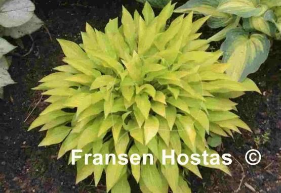 Маленькая хоста с жёлтыми, вертикально растущими листьями.