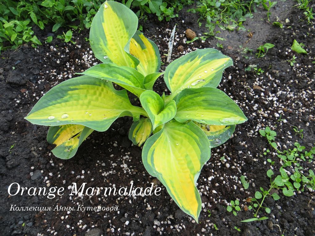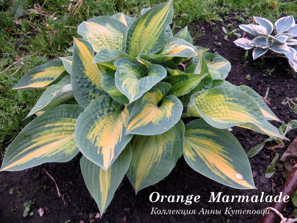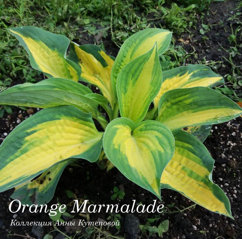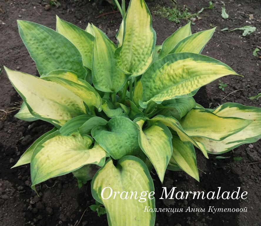 Листья жатые, желто-оранжевые, с сине-зеленой окантовкой. Летом оранжевый выгорает до кремового.