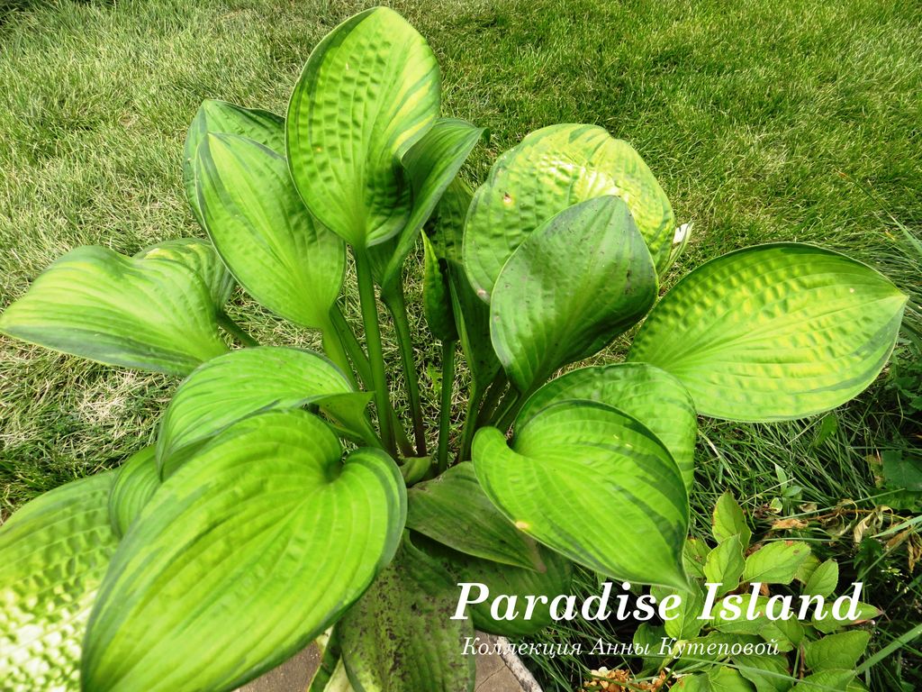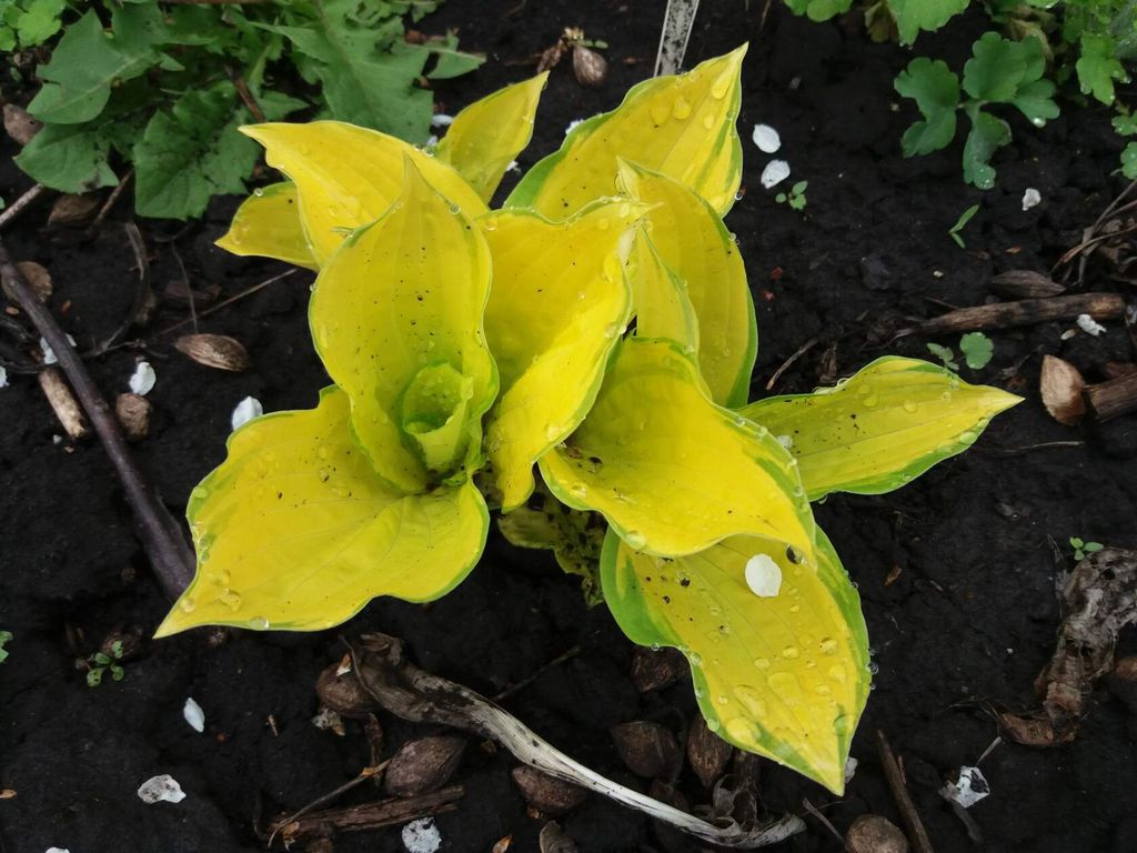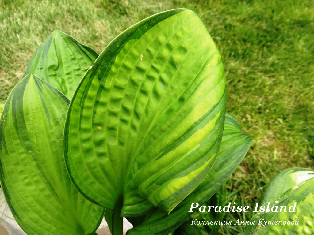 Летом хоста зеленеет, сохраняя контраст изящной перистой тёмно-зелёной каймы и светло-зелёного основного поля листа.