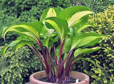 Кремово-желтые с зеленой каймой листья белеют втечение лета, пурпурный цвет черешков переходит на белое поле. Нарядная красавица!