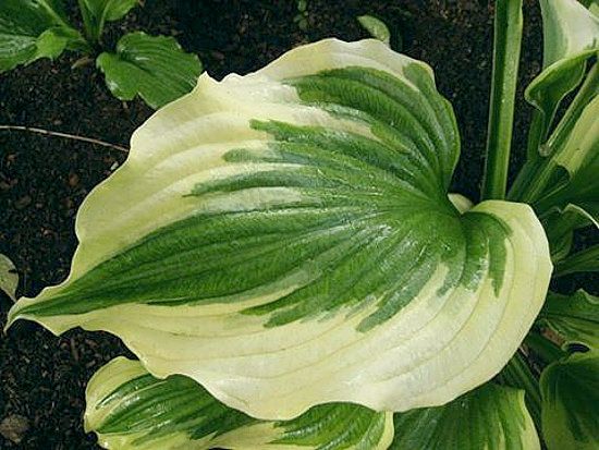 Листья зелёные с широкой желтой, переходящей в светло-кремовую каймой и волнистым краем.