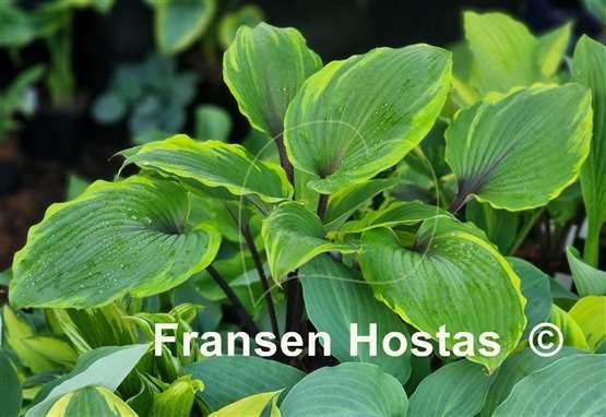 Листья зелёные с желтой каймой, на высоких красных черешках.