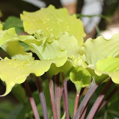 Желтые листья с гофрированным краем на красных черешках.