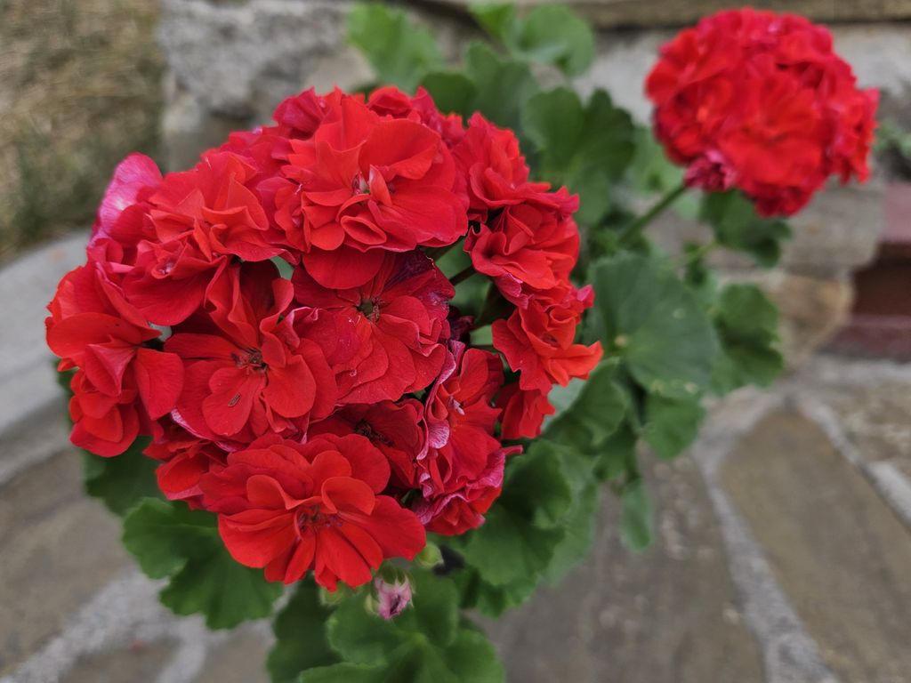 Пеларгония с огромными шапками темно-красных бархатистых цветов.