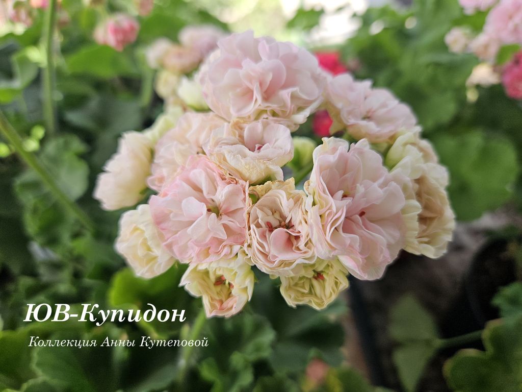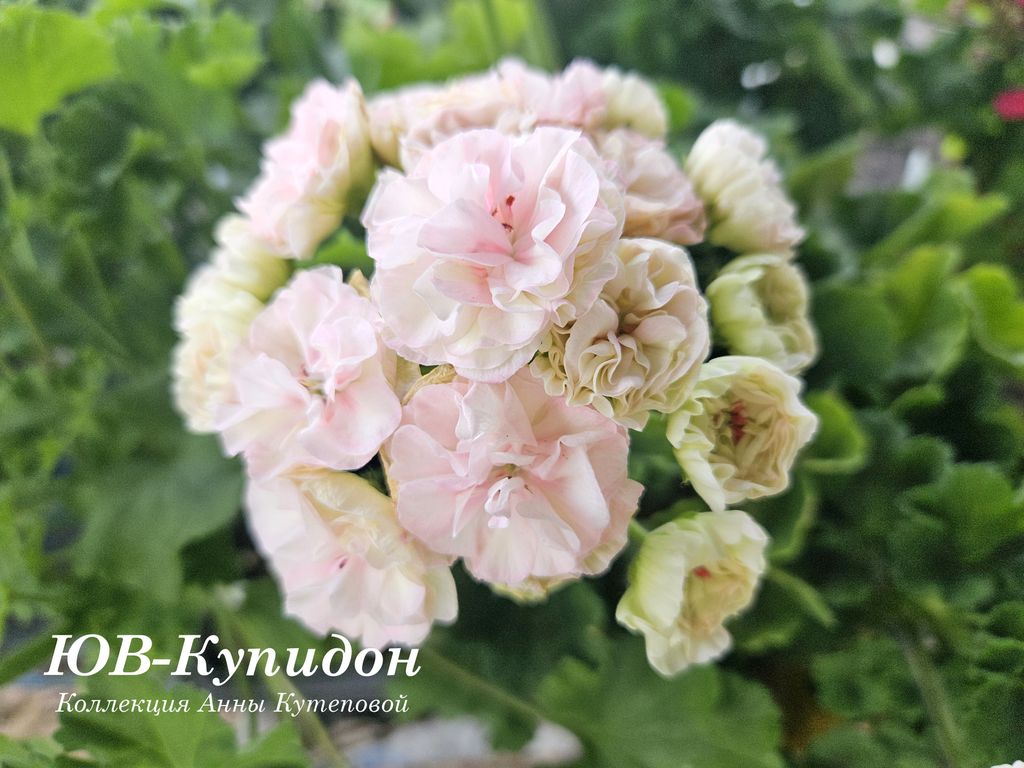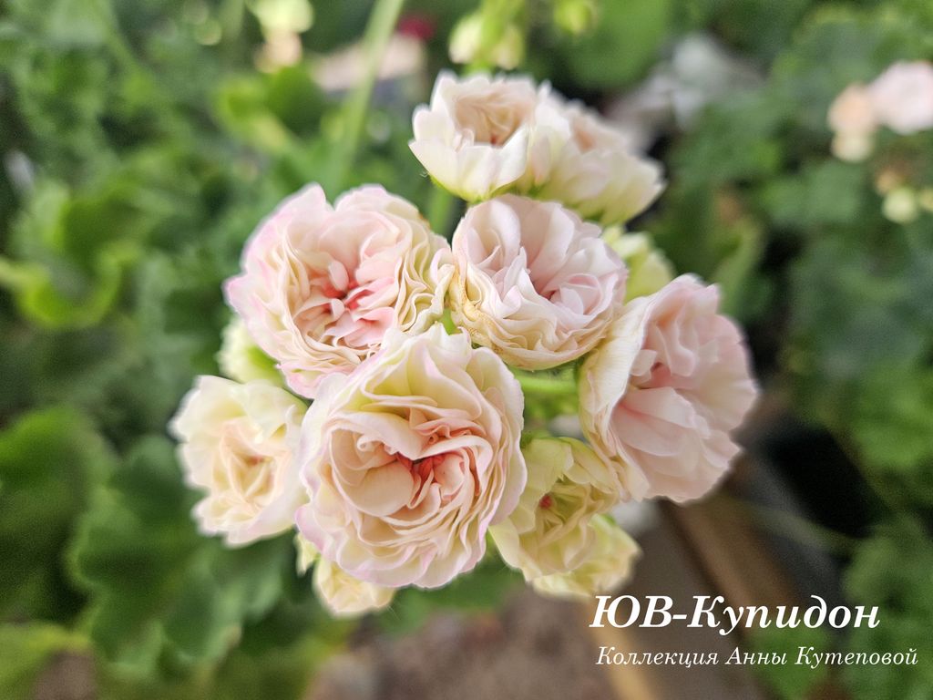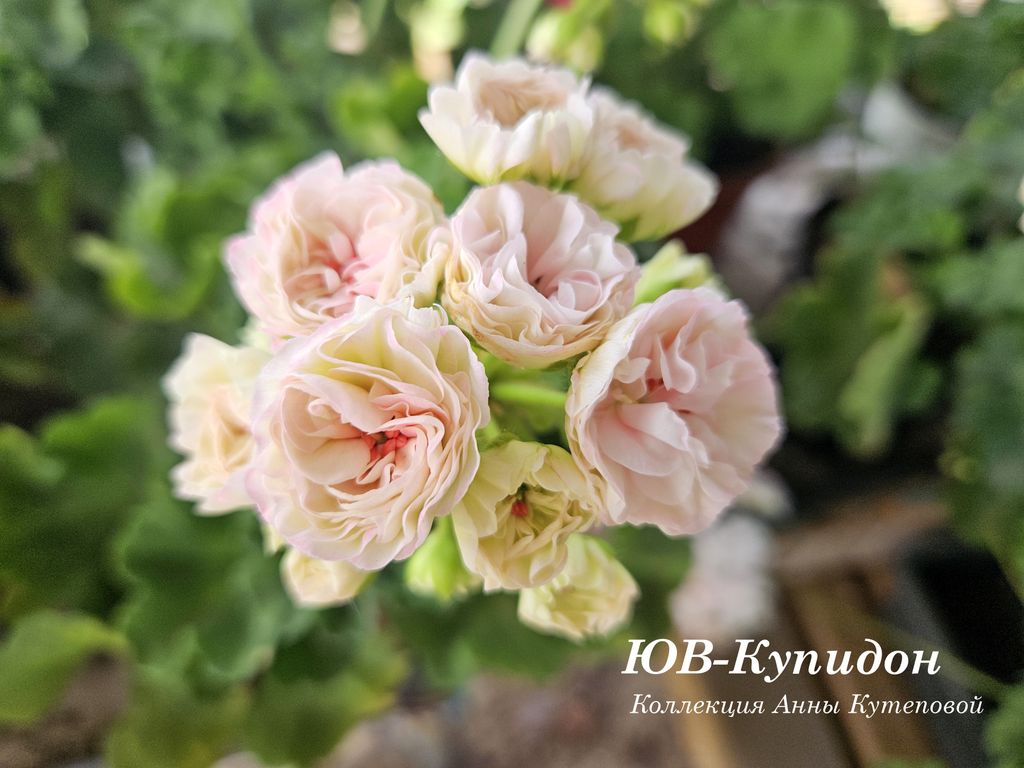 Цветы крупные, супермахровые, сливочно-розовые, при роспуске с зеленцой.