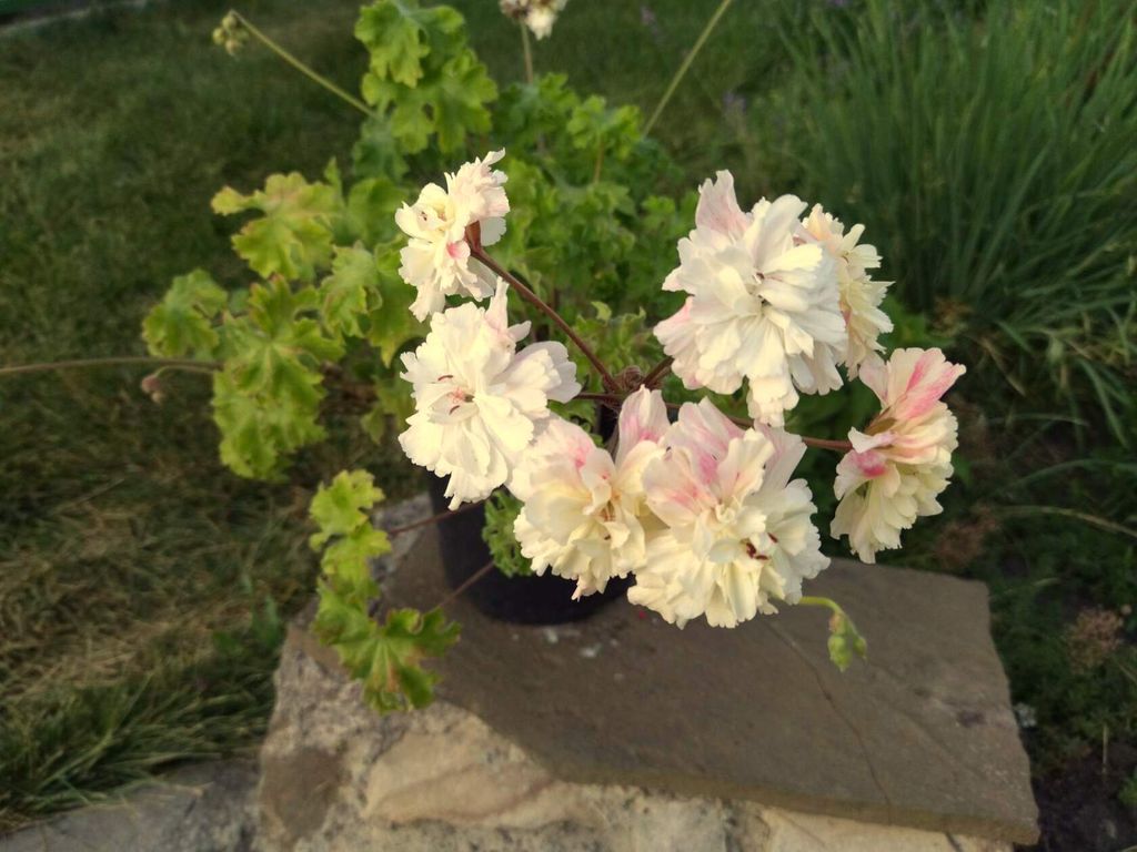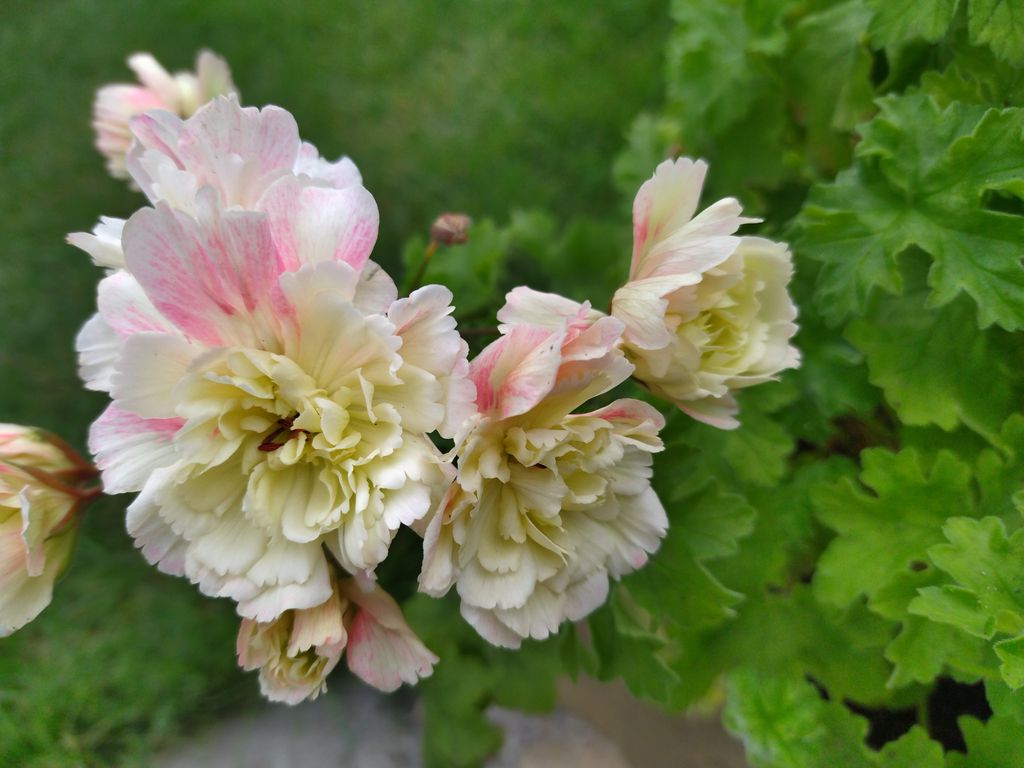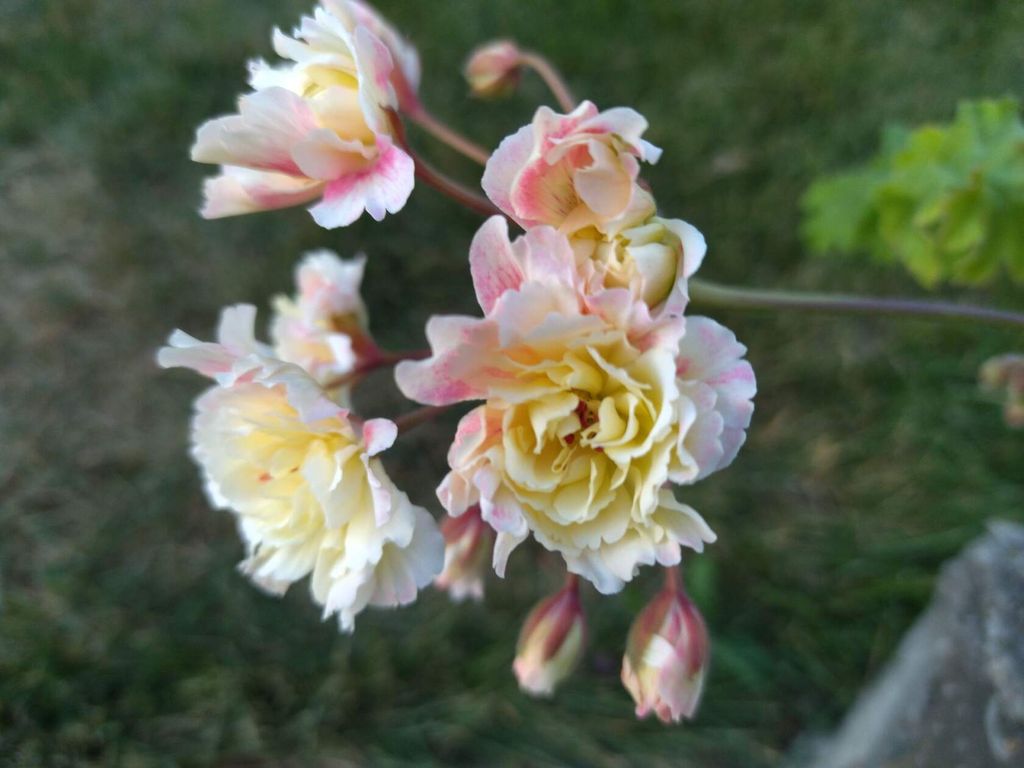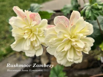 Цветы махровые, крупные и пушистые, кремово-желтые. Края лепестков нежно-розовые.